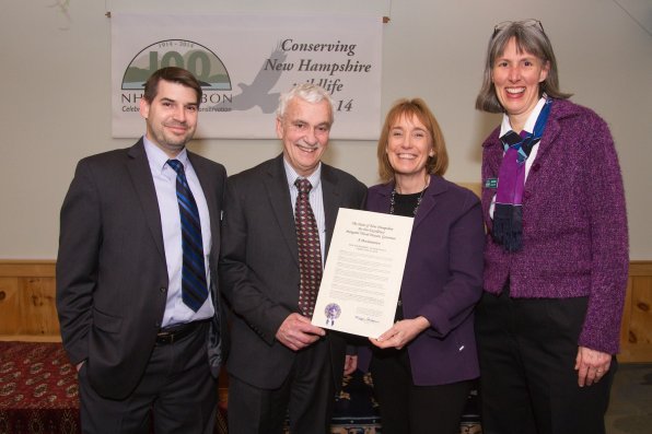 New Hampshire Audubon board chairman Tony Sayess, Audubon President Michael Bartlett, Gov. Maggie Hassen and Centennial Coordinator Ruth Smith with a big piece of paper.