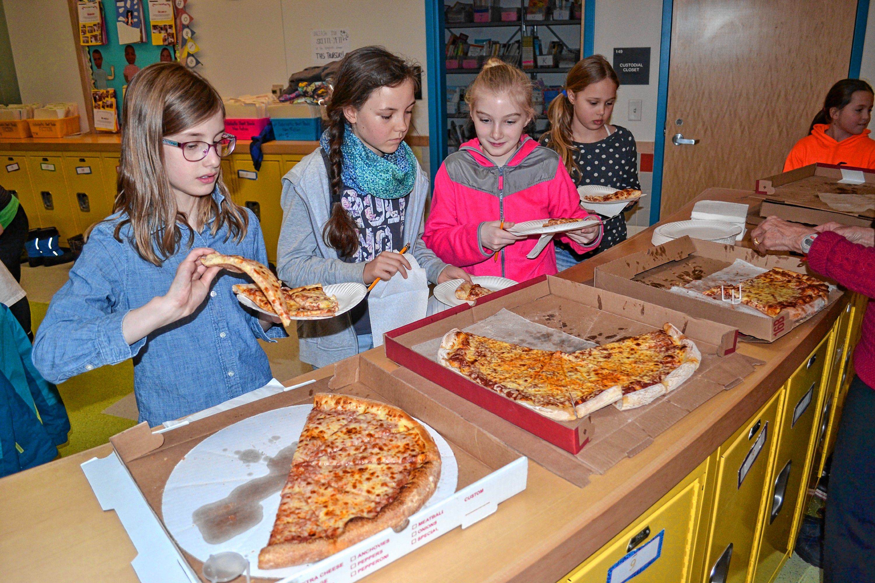Christa McAuliffe student council members Ella Brisette, Malia Moffett, Kenadee Couger and Mahalie Burdette grab slices of pizza from Constantly Pizza, Vinnie’s Pizzaria and Sal’s Pizza during a blind taste-test at the school last week. TIM GOODWIN / Insider staff
