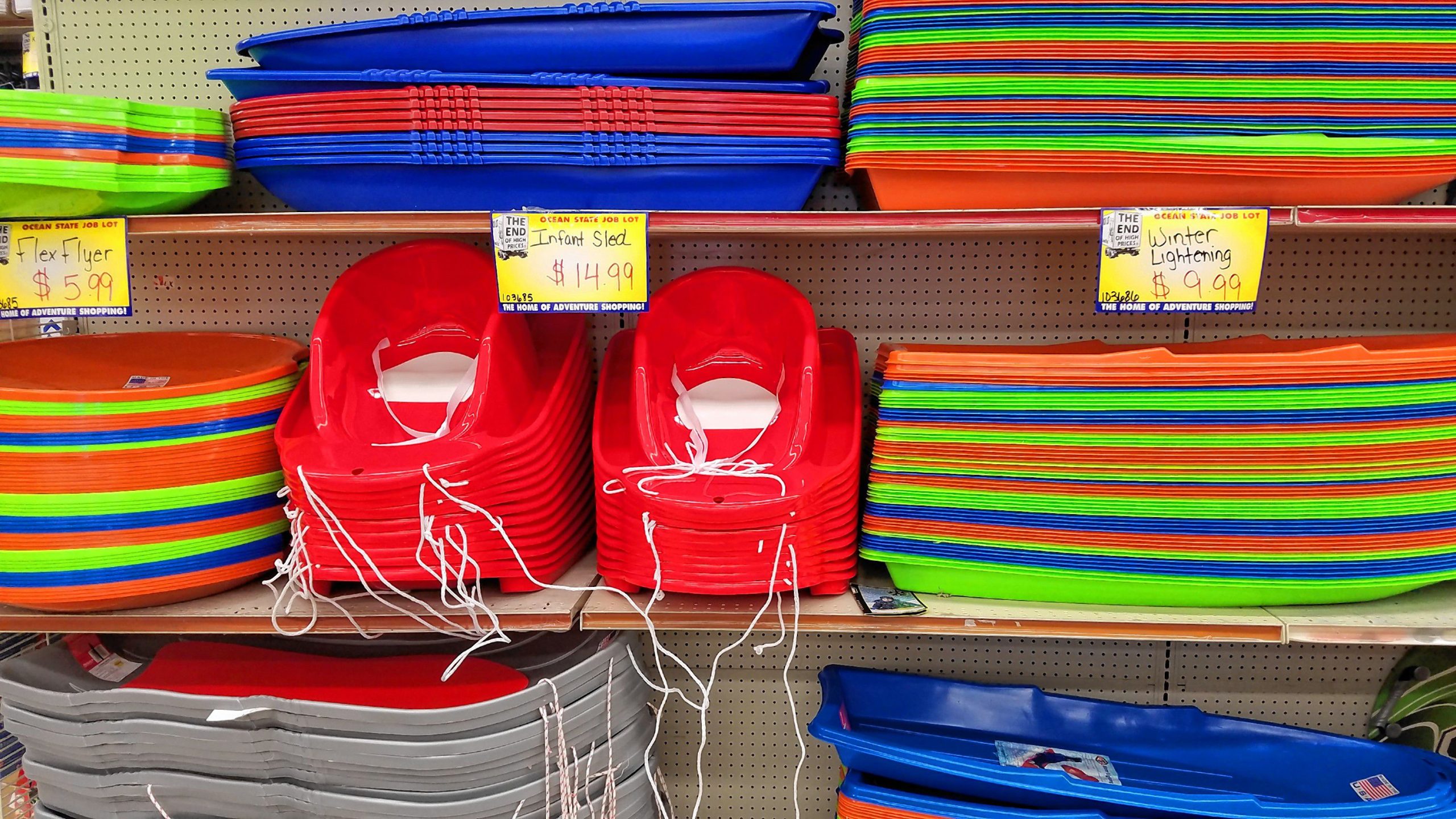 By the looks of it, the Job Lot has almost enough sleds for every kid in the city. You can’t go wrong with a classic, no-nonsense plastic sled as a Christmas present. JON BODELL / Insider staff