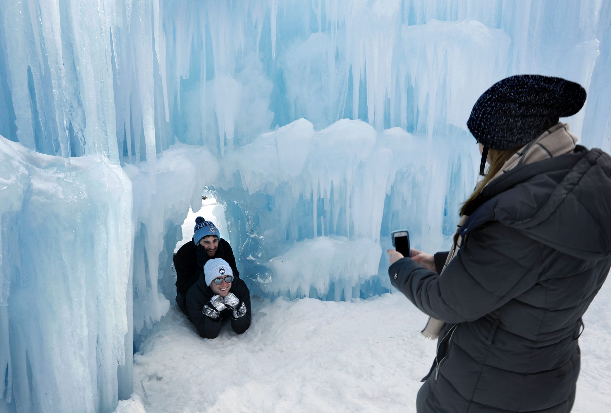 In this Saturday, Jan. 26, 2019 photo, visitors pose for a photo in a tunnel at Ice Castles in North Woodstock, N.H. With a seemingly endless variety of photo-ops, most visitors have a hard time putting their cameras down. (AP Photo/Robert F. Bukaty) Robert F. Bukaty