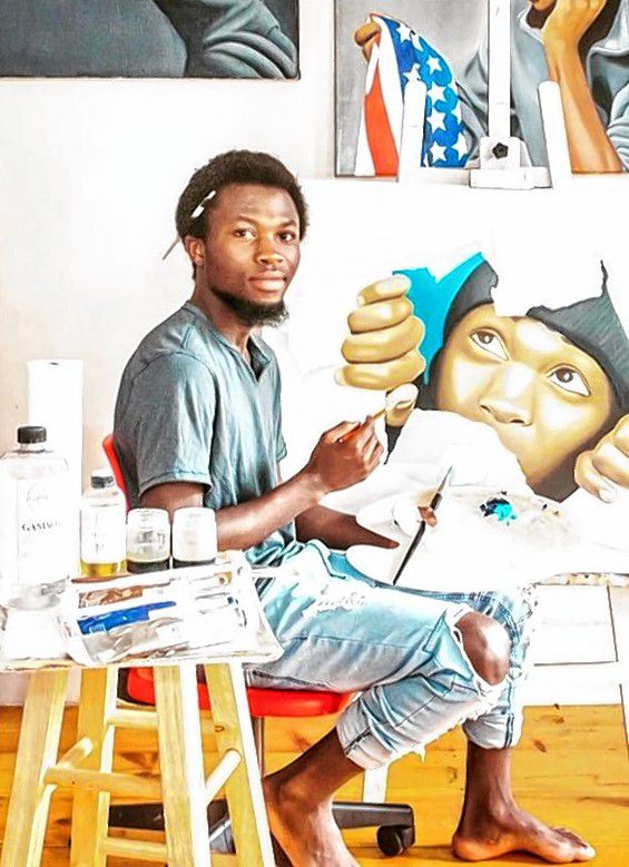 Jozimar Matimano, in his Manchester studio, initially developed his artistic skills in the Democratic Republic of the Congo before his family fled to a refugee camp in Uganda. He now studies art at the New England College.