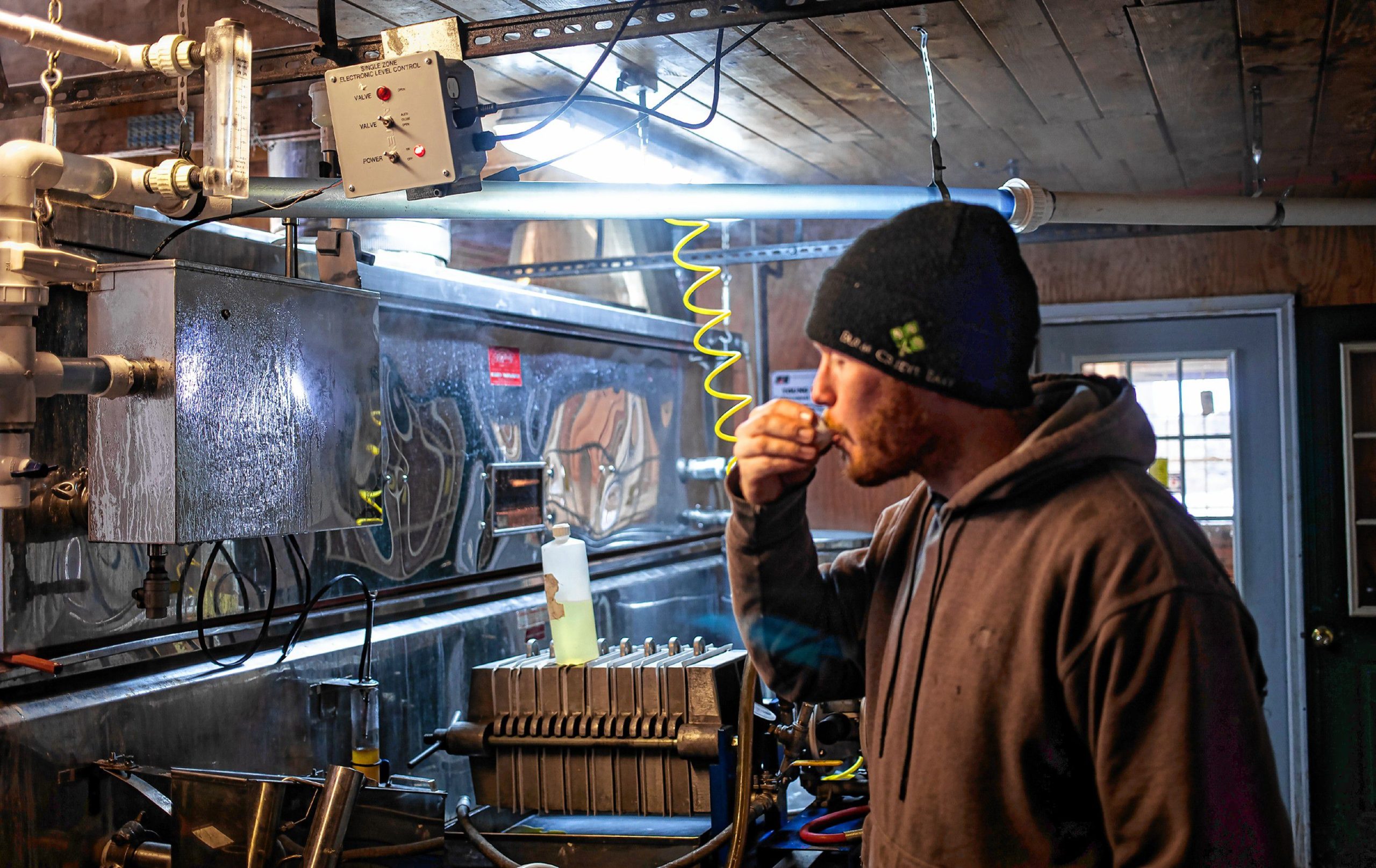 Jeff Moore tastes the final product as the evaporator makes syrup.